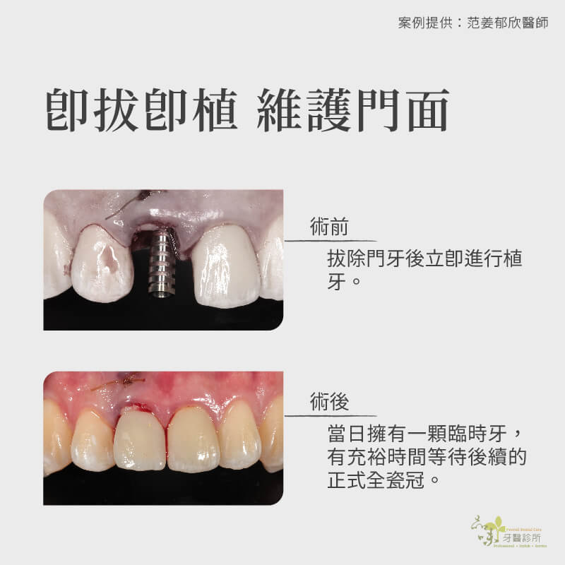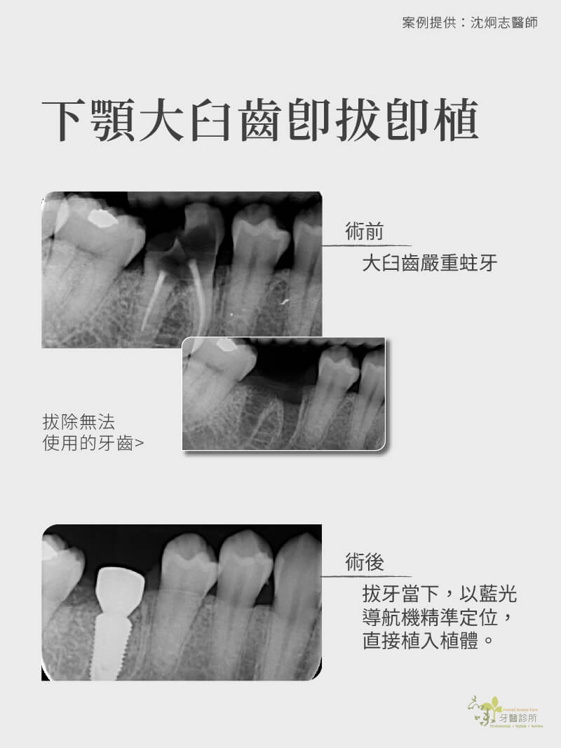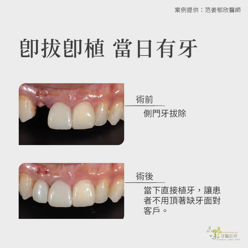 以即拔即植方式,用一次手術完成拔牙、植牙的治療,讓患者不用頂著缺牙面對客戶。