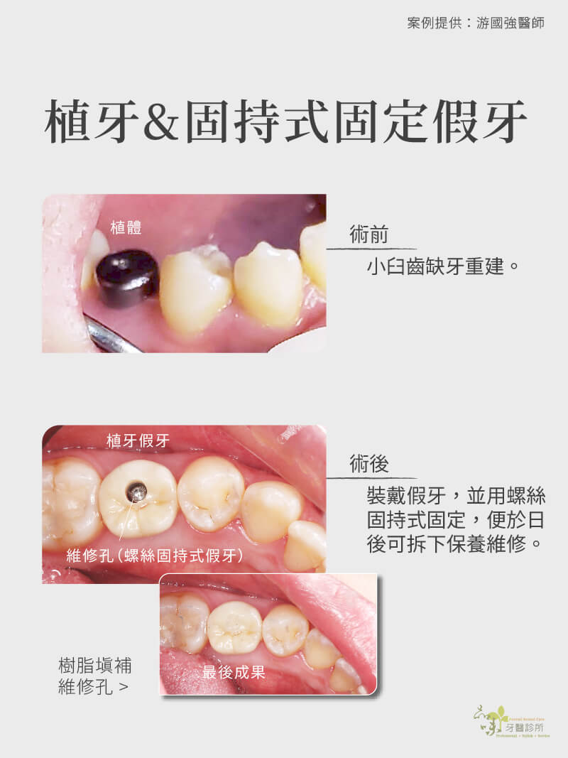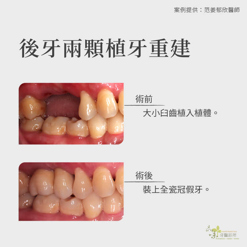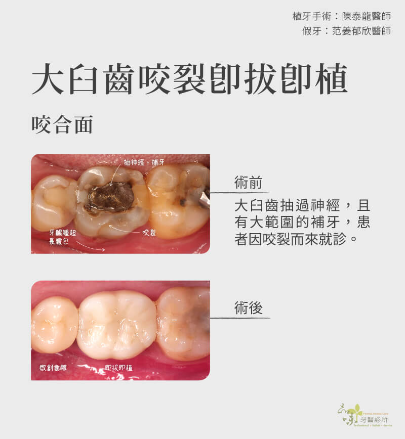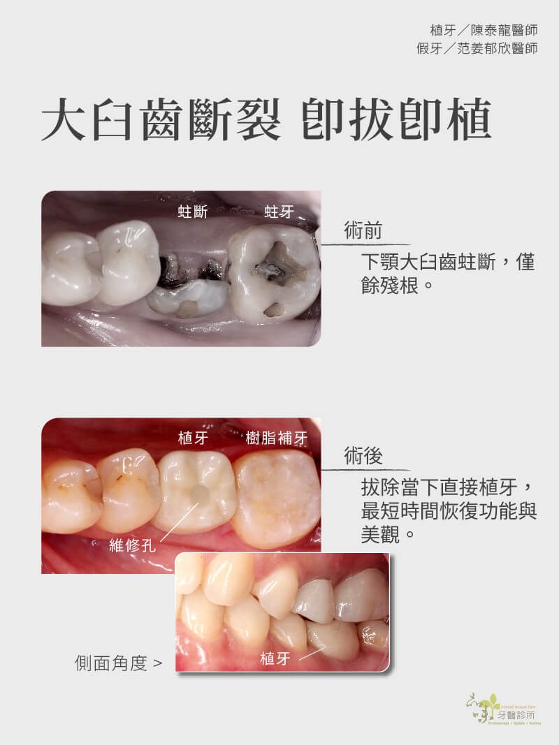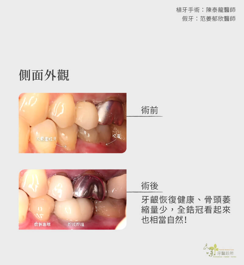 採即拔即植的方式,拔除了無法使用的牙根同時植入植體、再製作假牙,以最短時間內修復了重要的後牙咀嚼功能。由於只做一次手術,病人也不會感到不適,裝上假牙後,已經可以開心吃吃喝喝了!:D