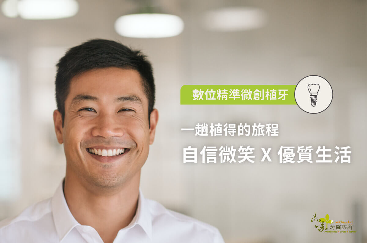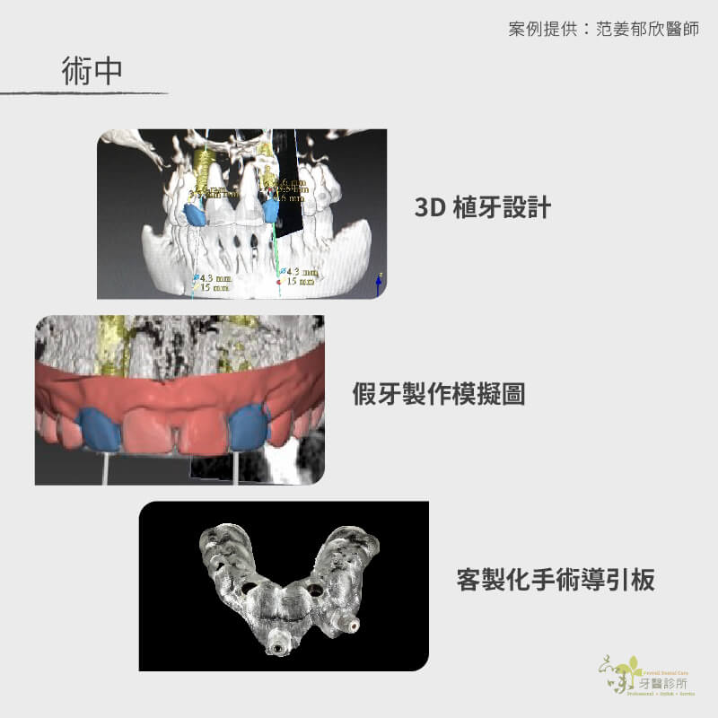 數位化加快植牙設計的速度及精準度,以電腦模擬植體位置和術後假牙的成果,並製作手術導引板,完成精準植牙,在預期好的位置裝上假牙。
