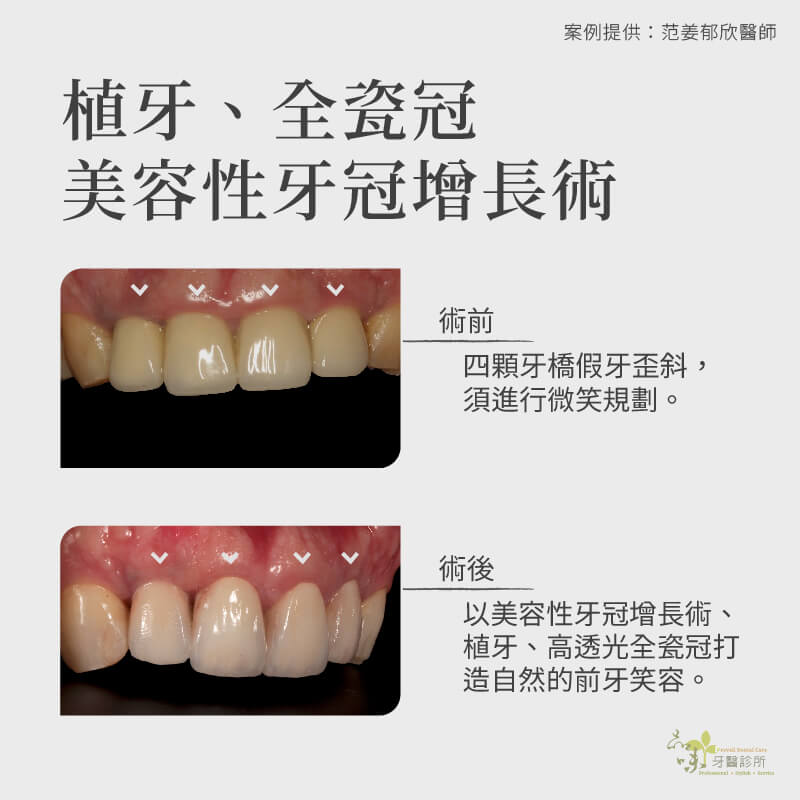 植牙、假牙合併牙冠增長術,打造圓滿的微笑曲線,全瓷冠的紋理、弧度皆仿真牙,透光度佳。