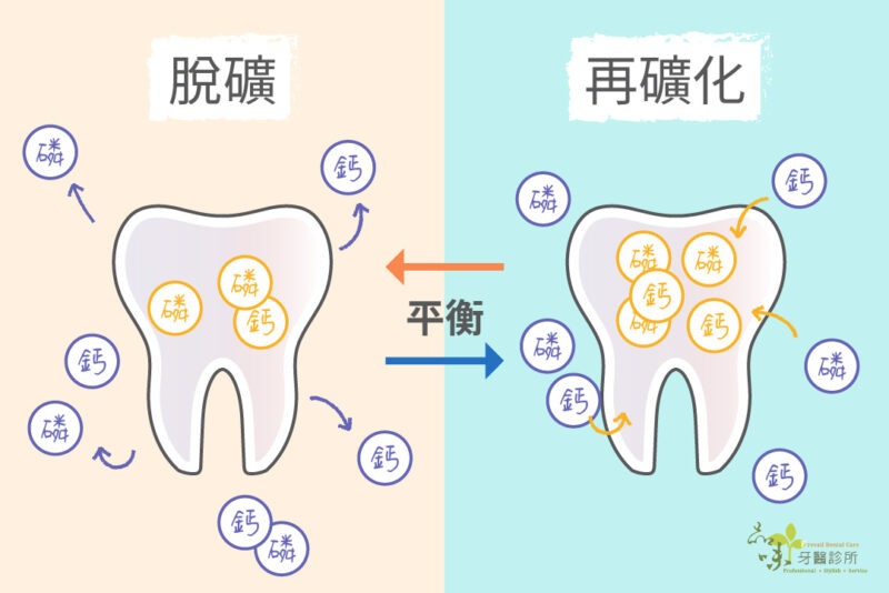 牙齒主要的硬組織成分為羥磷灰石,其中的鈣離子與磷酸鹽會因為酸而進行解離,這種結構的解離就叫做脫礦。當脫礦情形僅侷限在珐瑯質,就有可能再礦化。