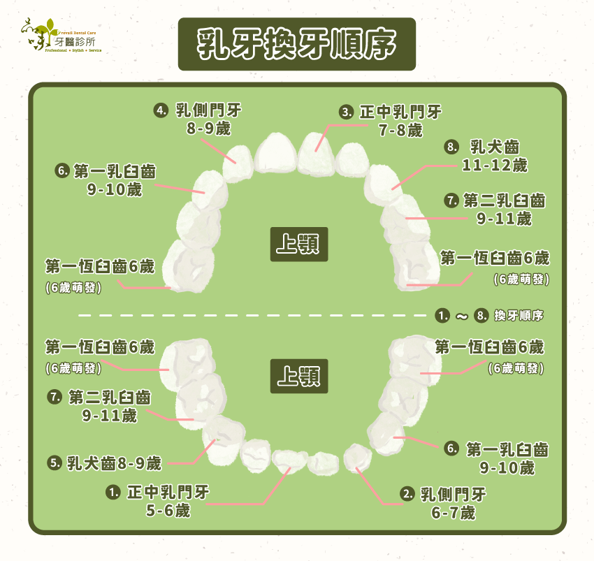 大多數人,乳牙20顆,恆牙32顆。小朋友12-13歲後換牙結束,口內的恆牙要用一輩子,牙齒不會再生。我們不像是兔子,牙齒可以持續不斷地生長,所以我們要好好愛護我們的牙齒們。