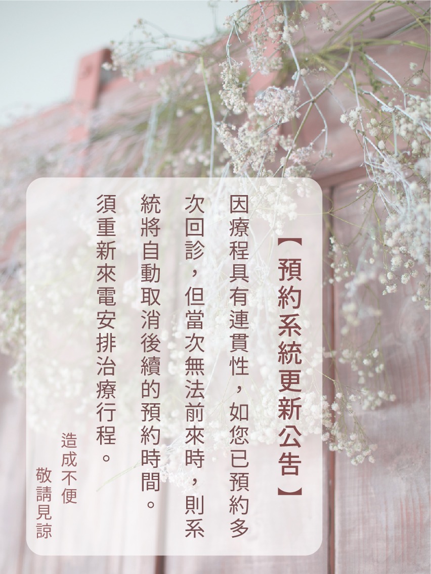 品味系統更新了唷! 因療程具有連貫性,如您已預約多次回診, 但當次無法前來時,則系統將自動取消後續的預約時間。