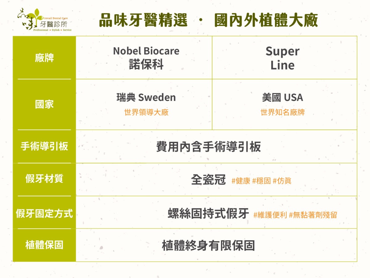 國際大廠植體品牌口碑有保障,再藉著結合導引式植牙、螺絲固持式假牙及全鋯冠這幾項特色,提供更優質的植牙服務。